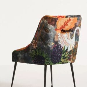 Eclectic floral chair with plush velvet upholstery and metal legs, ideal for adding artistic flair to bohemian interiors.