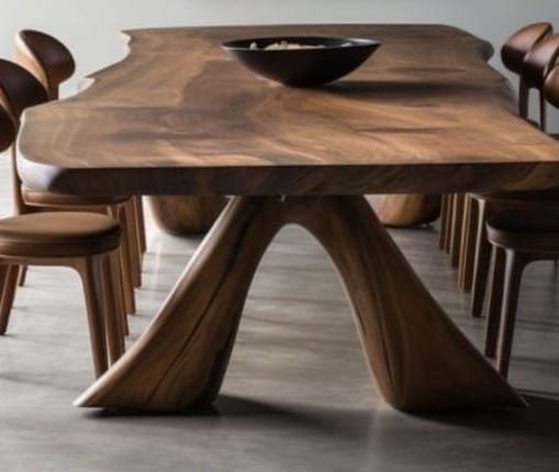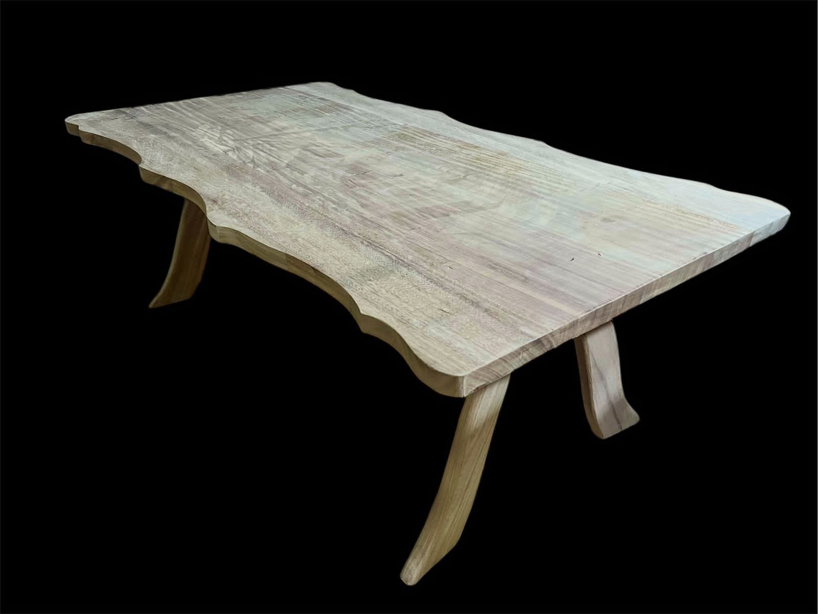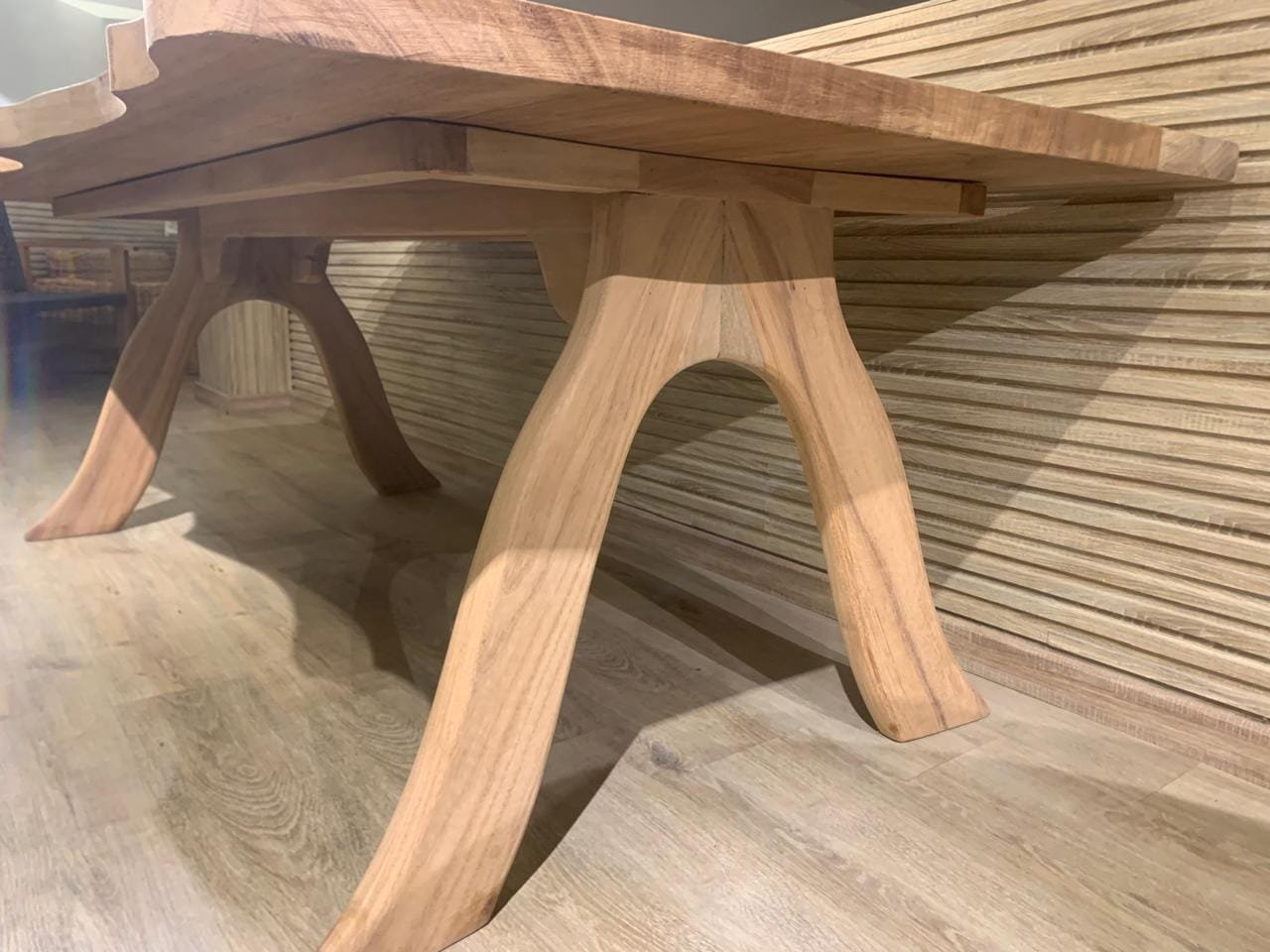 A sculptural live-edge teak table designed for lasting beauty in any outdoor space.